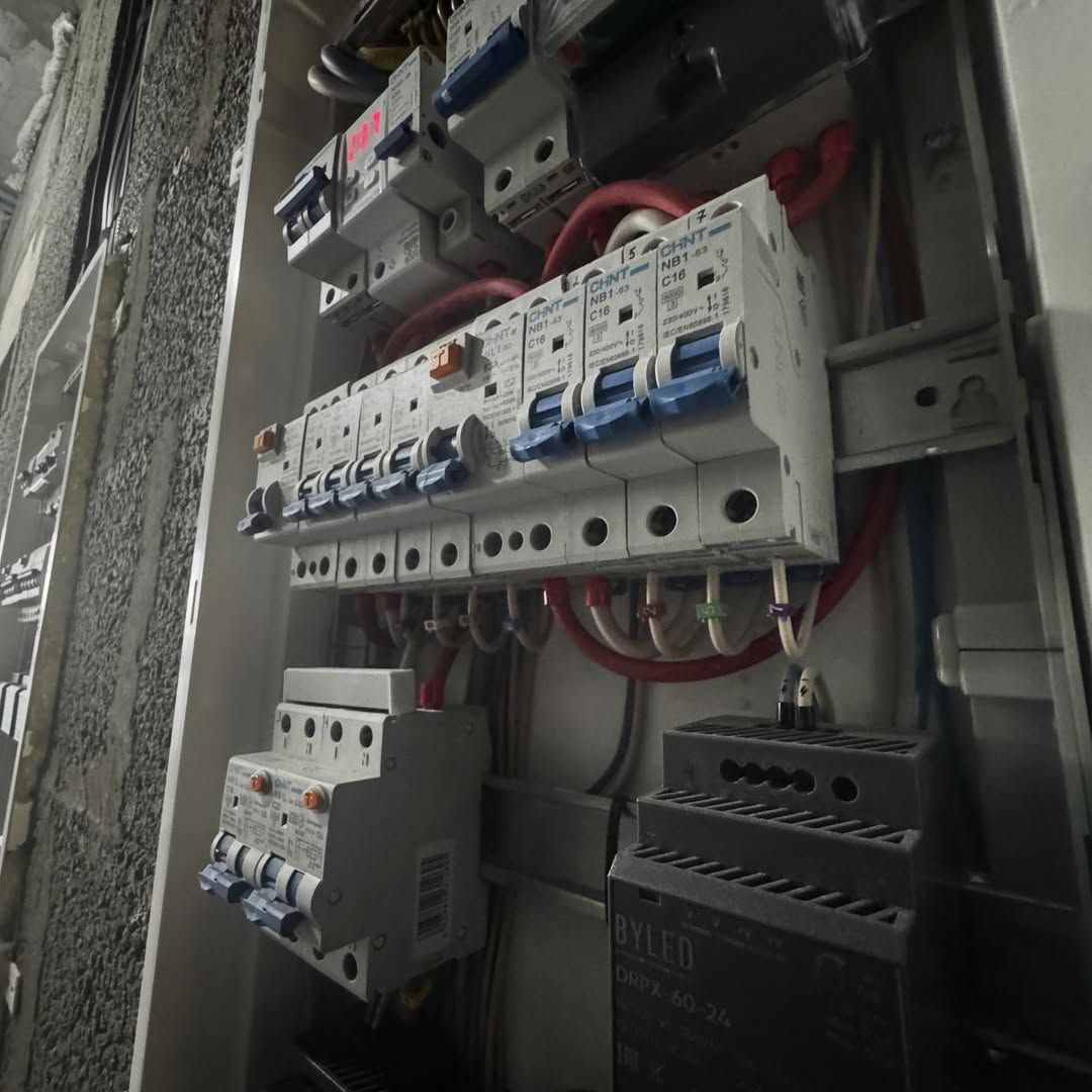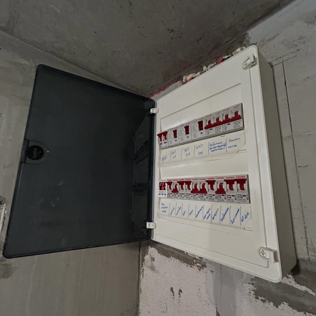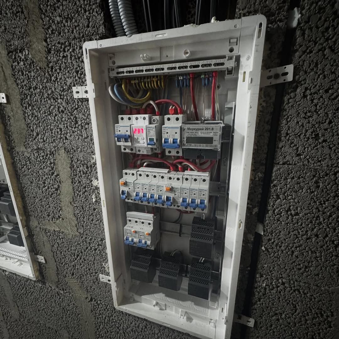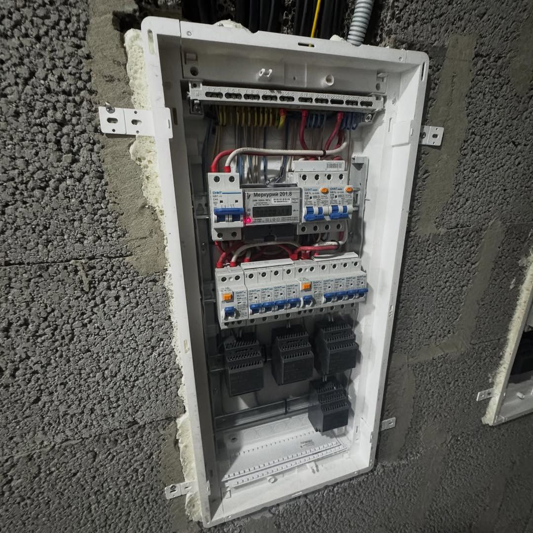 ☑️ собран щит силовой, зона модема убрана в шкаф на верхнюю полку ☑️ на входе сделаны выводы для навесного домашнего телефона (для работы как домофон) ☑️ выполнен проводной интернет к ТВ ☑️ сделана ТВ зона с закладной в гостиной ☑️ в спальне установлены проходные и перекрестные выключатели освещения ☑️ установлены розетки и выключатели по квартире